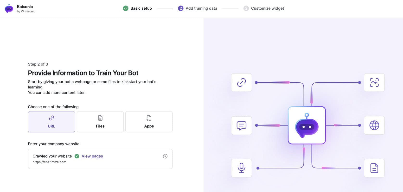 When you log into Botsonic for the first time, you train it on your data. The setup starts with adding your data sources: