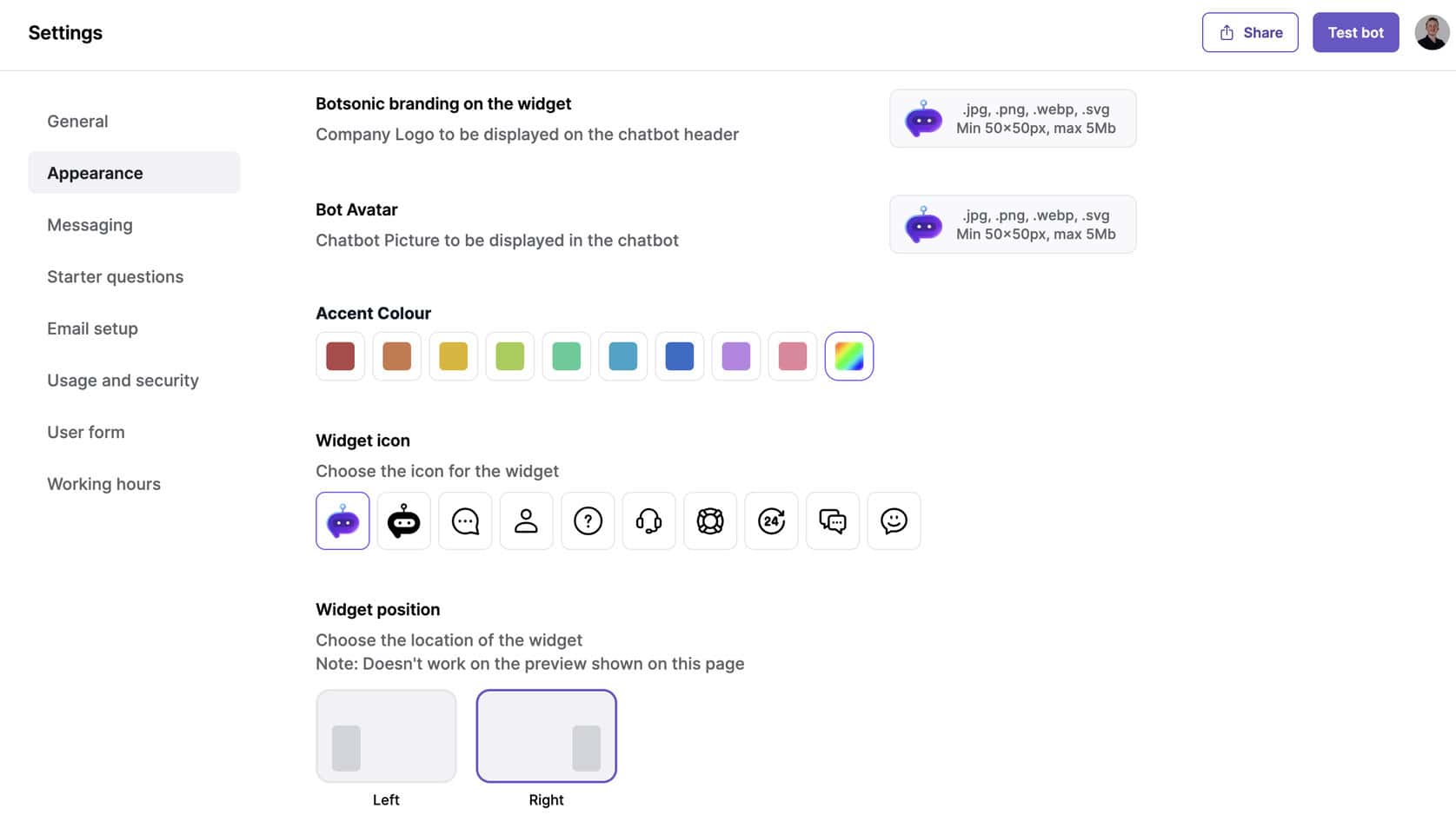 The website widget lets you embed the chatbot on your site with a simple script. You can customize its:
