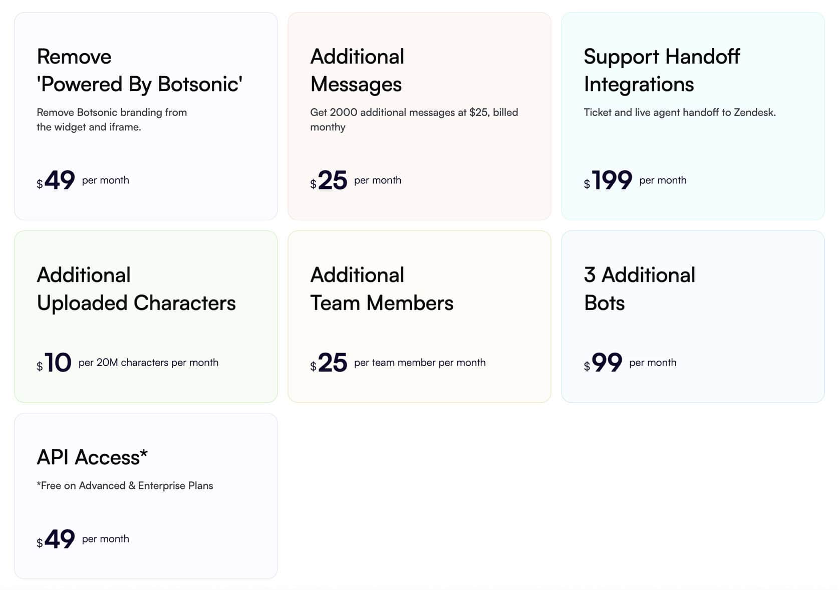 Botsonic also offers add-ons that let you expand your plan without upgrading completely. You can purchase extra message capacity or character limits as needed, which helps keep costs predictable.