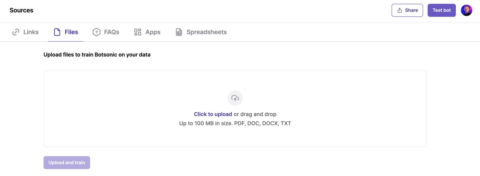 Once you’ve uploaded your data, click Upload and Train. Botsonic will process everything automatically.