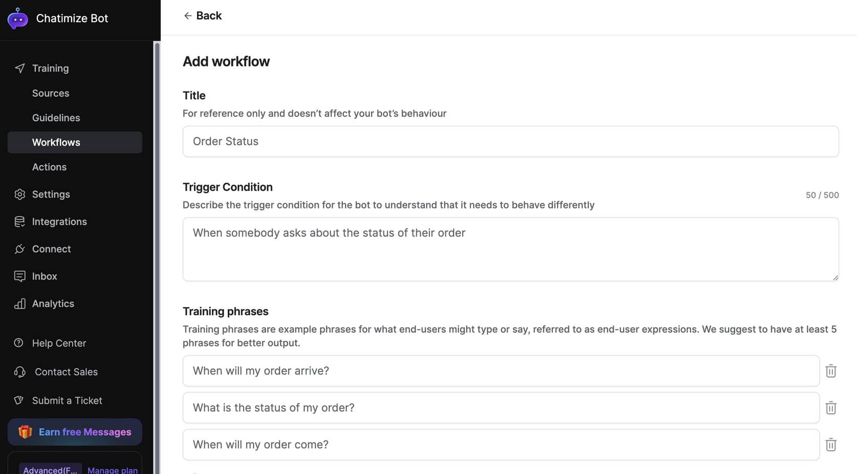 AI Workflows determine when your bot should trigger certain actions. You can define specific phrases or intents, such as “Where is my order?” or “Book an appointment”. Then you can map those to the corresponding AI Action.