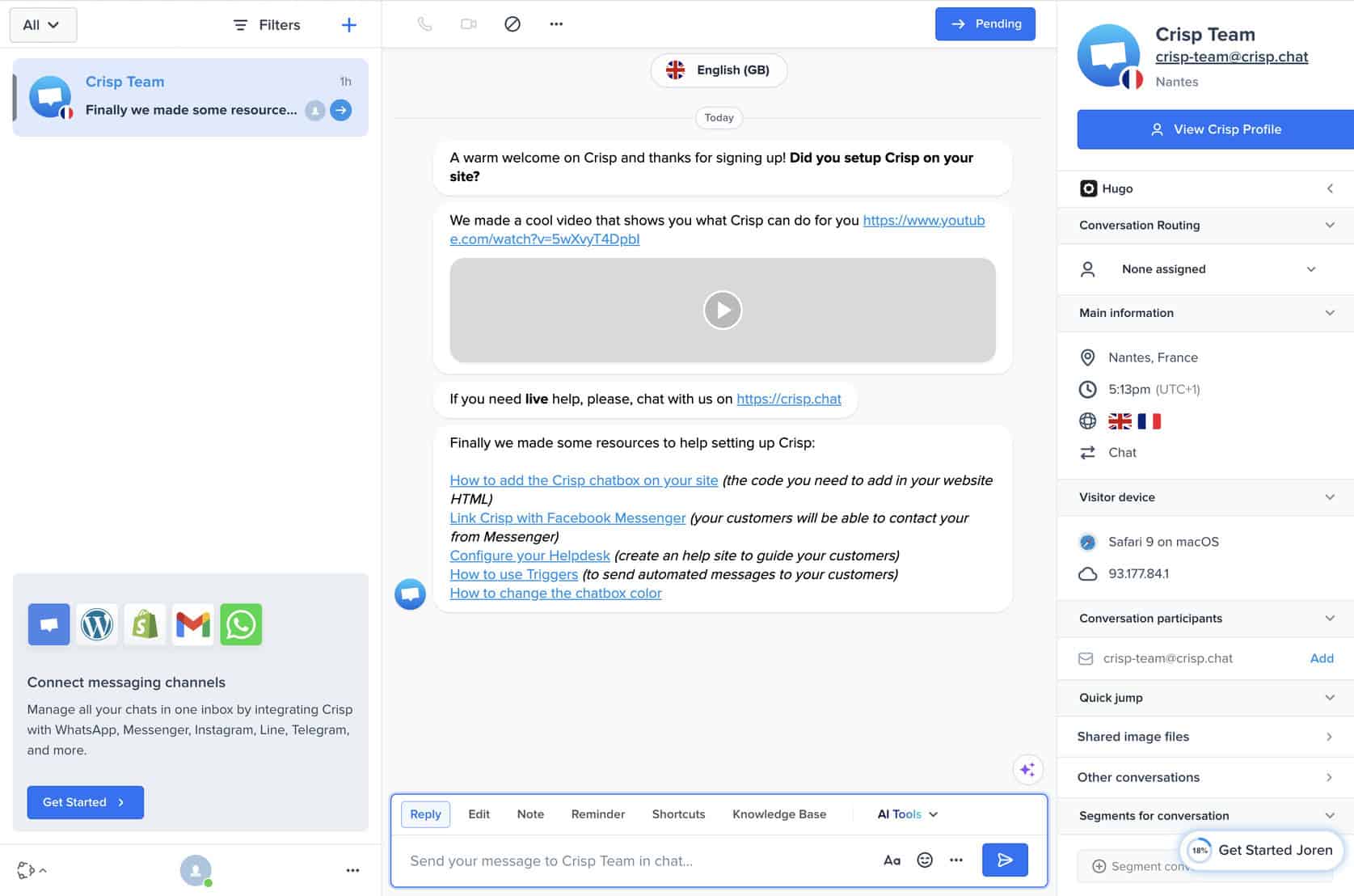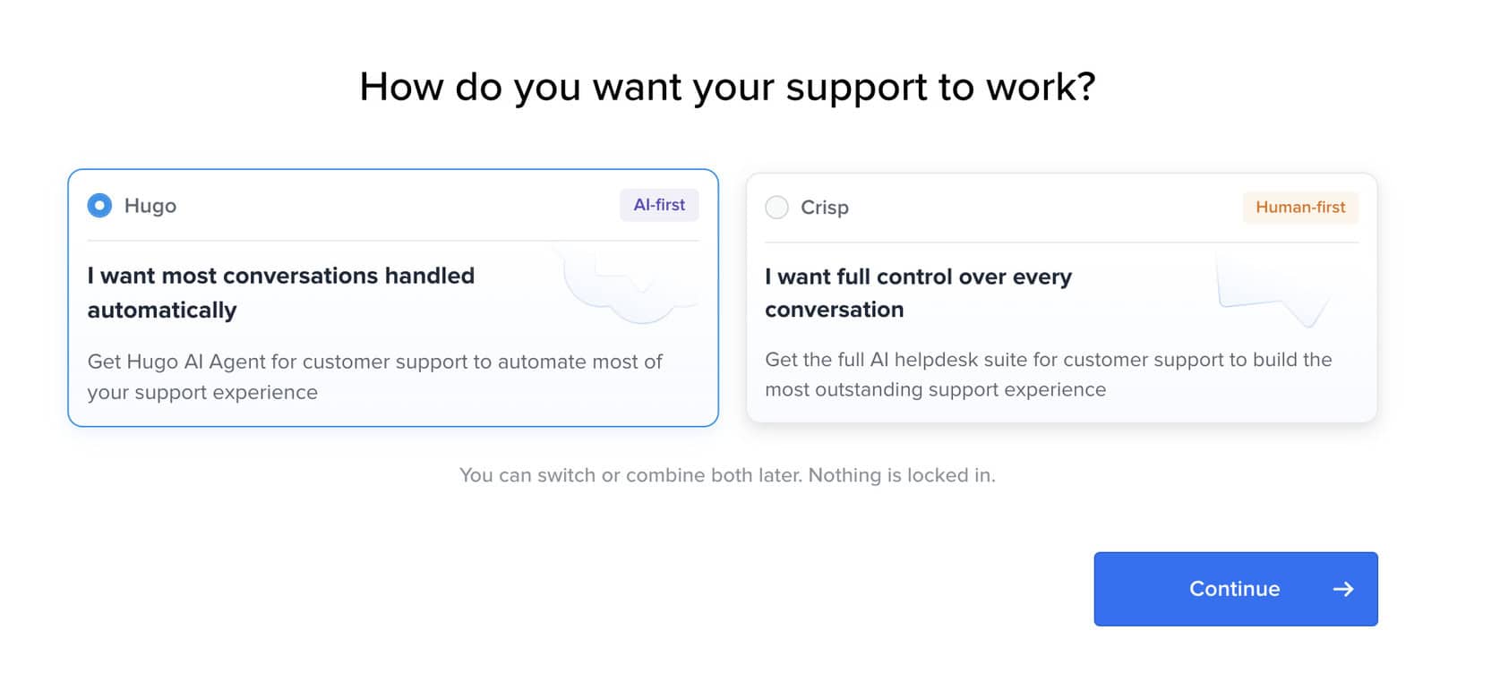 If you choose AI-first, Crisp focuses on letting Hugo, its AI agent, handle most conversations automatically. If you choose human-first, the platform is set up more around live agents, with AI added where useful.