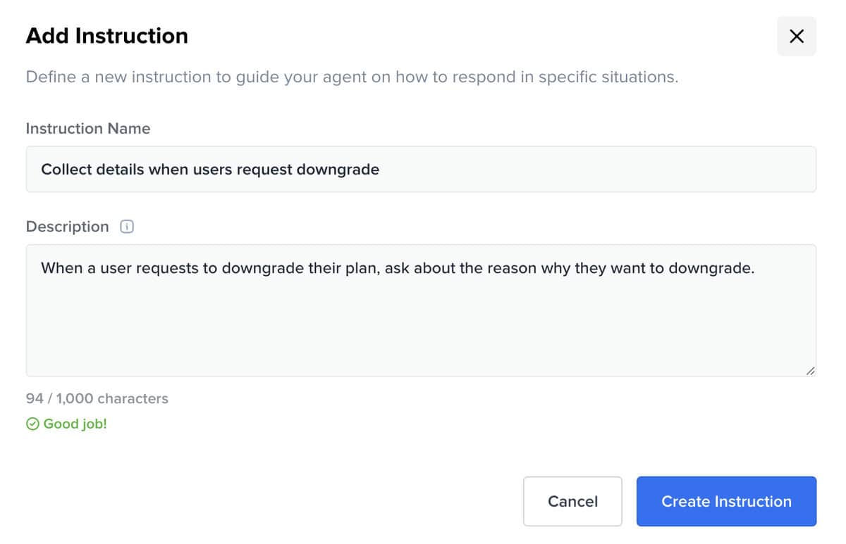 Crisp lets you create custom instructions for specific situations. For example, you can tell the AI to ask follow-up questions when someone wants to downgrade their plan, instead of just giving a generic response: