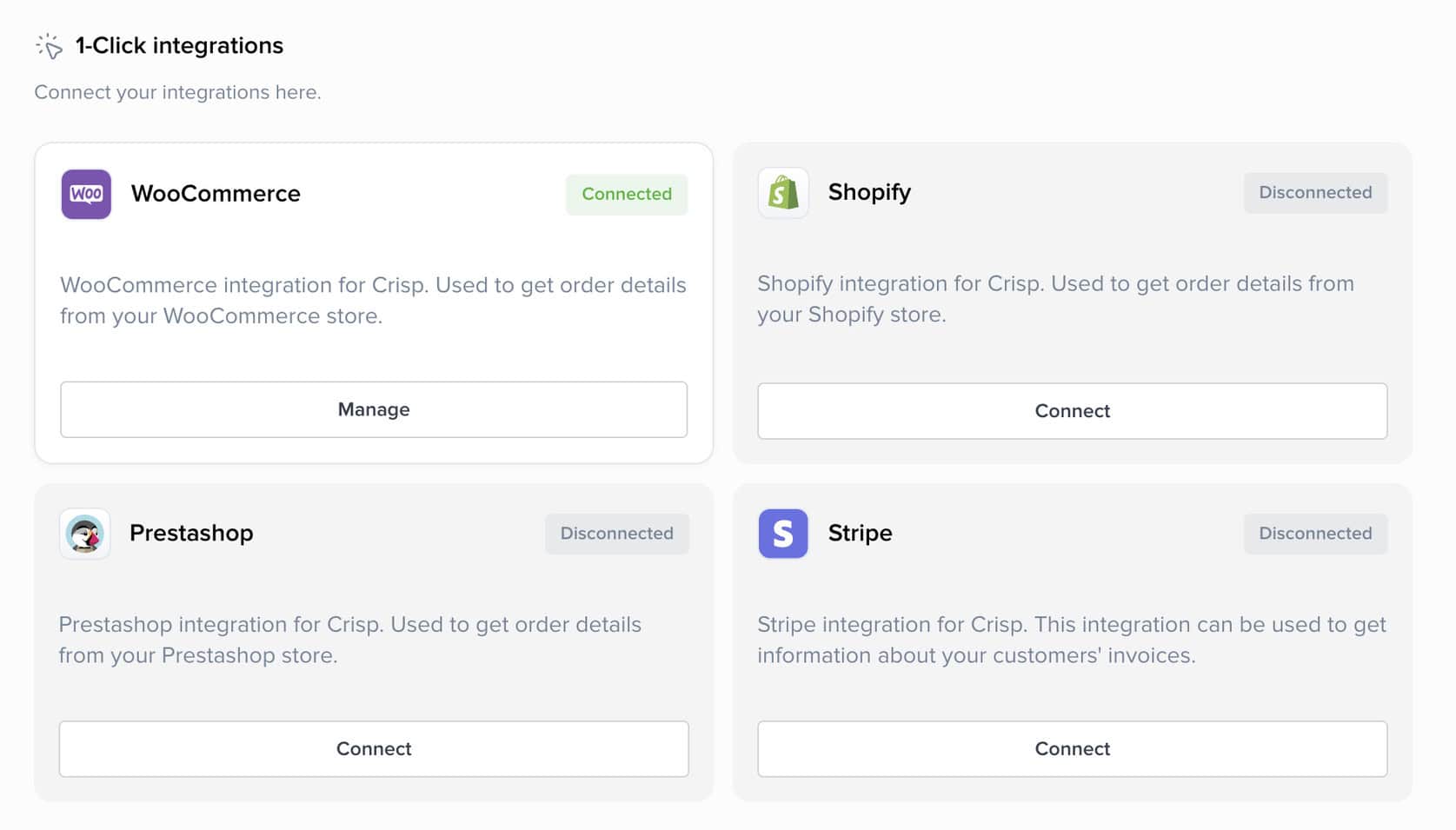 And besides these general integrations, Crisp also supports AI integrations through Hugo. As I mentioned earlier, the chatbot can connect with platforms like WooCommerce, Shopify, Stripe, and PrestaShop.