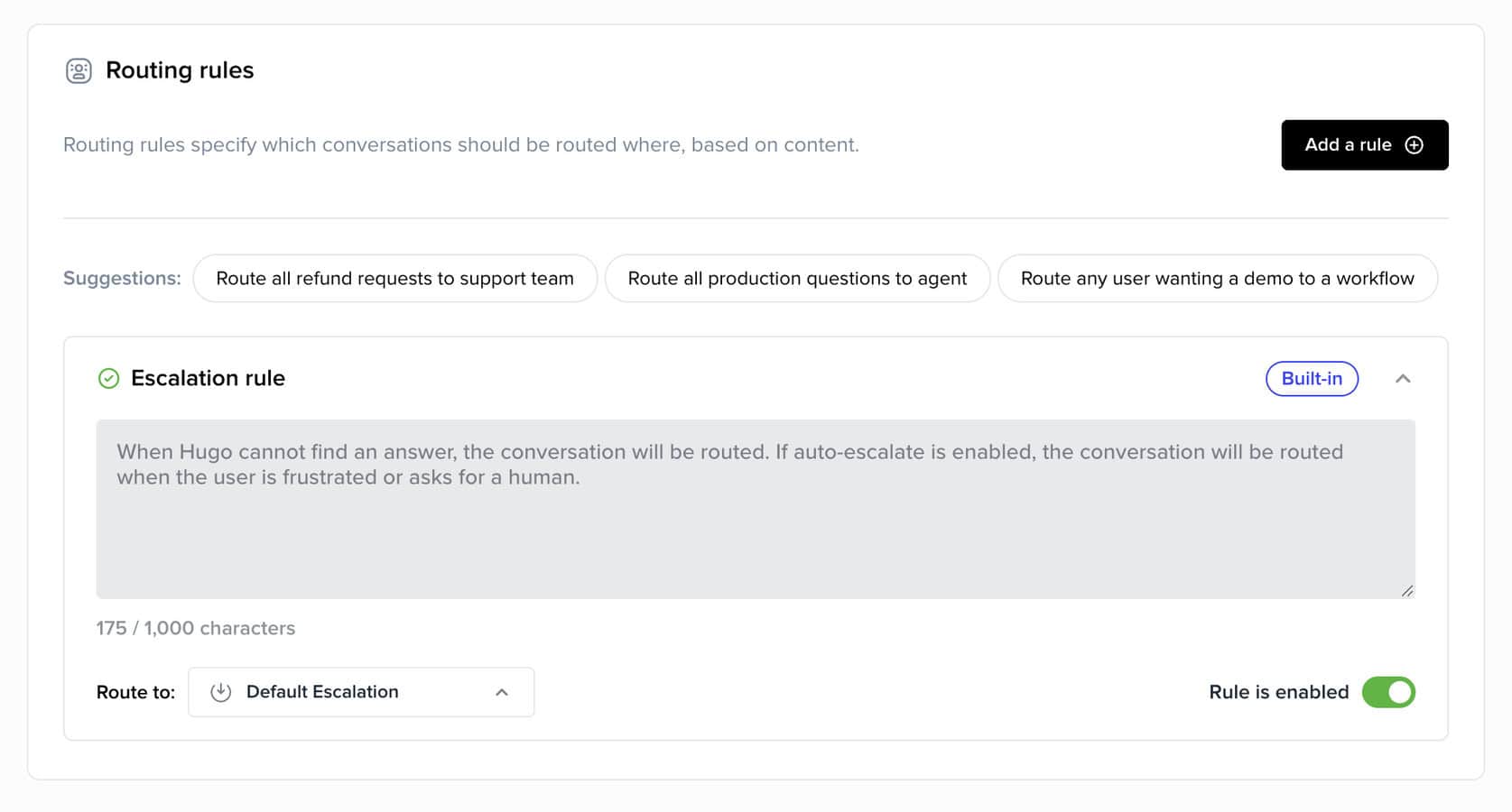 With routing rules, you can decide when a conversation should stay with Hugo and when it should be passed to a human agent or another destination.