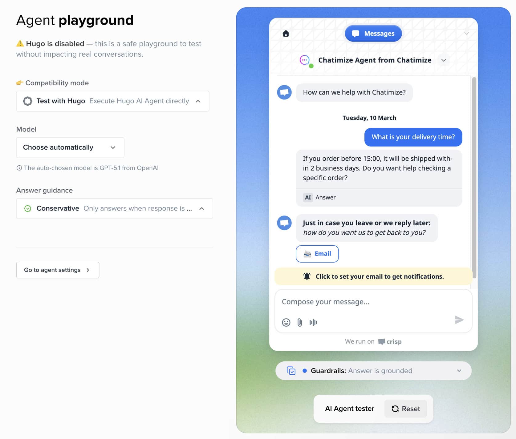After that, Crisp automatically creates the chatbot for you, and you can test it right away in the built-in playground: