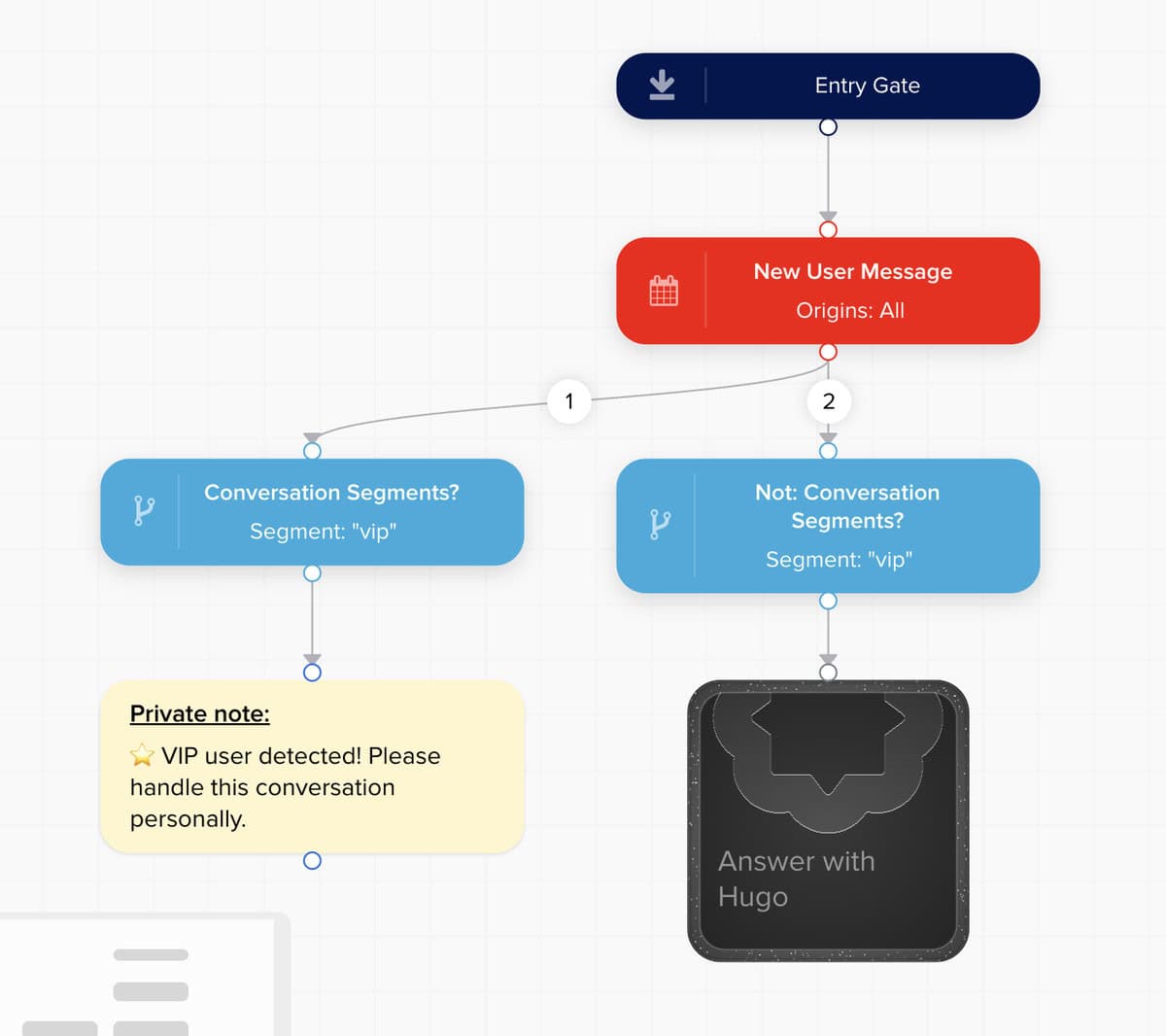 So instead of Hugo handling everything, you can build a visual flow that decides what should happen in different situations. For example, you can create flows that send VIP users to a human agent while everyone else is handled by Hugo: