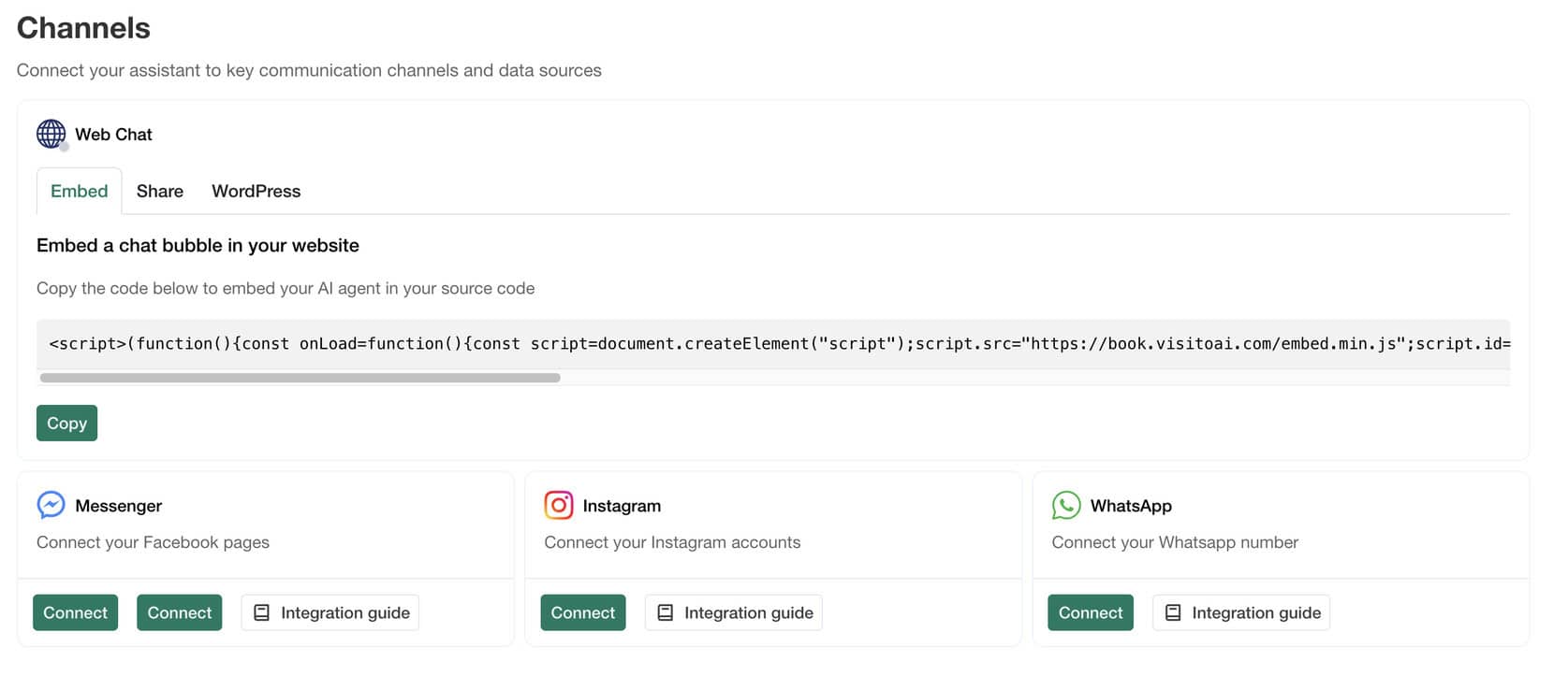 Visito AI supports four channels, so you can connect your chatbot to wherever your customers are. You can integrate it with: