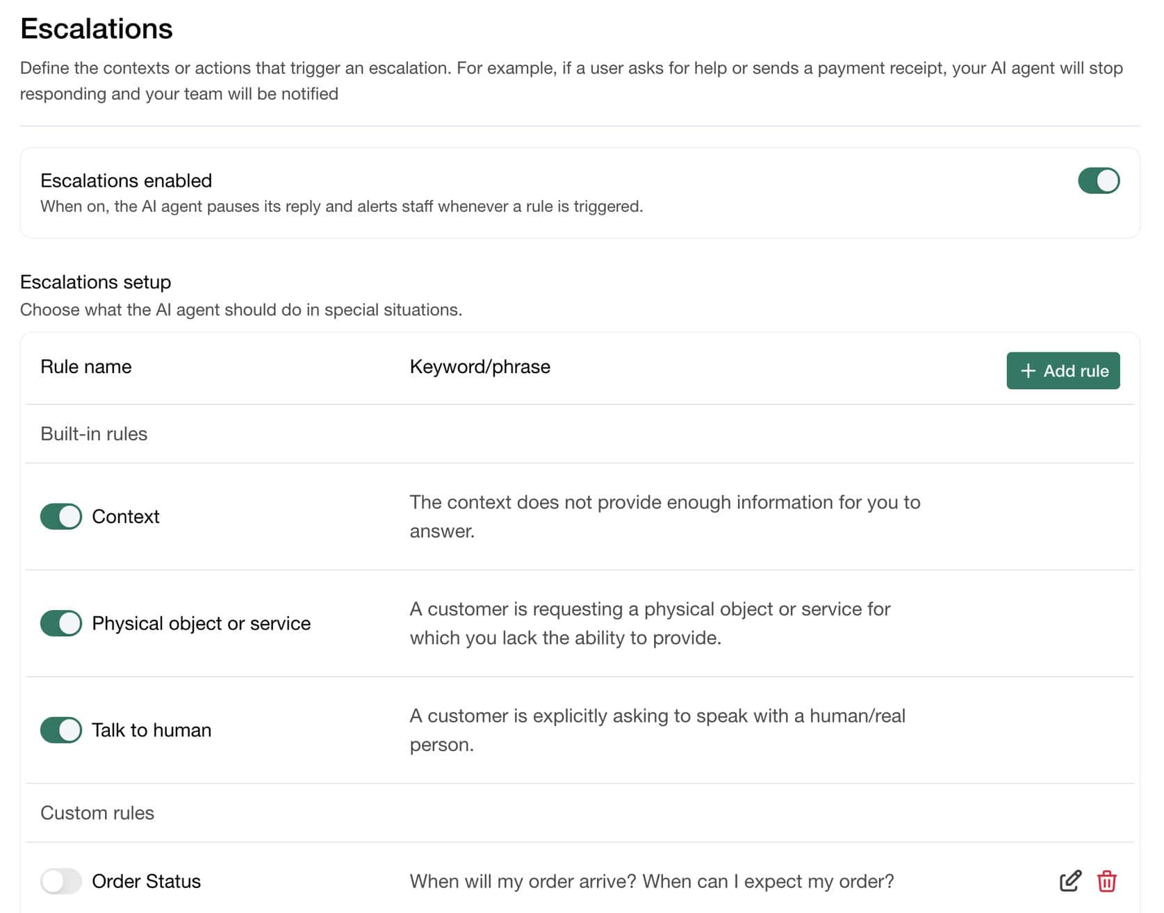 You can use pre-defined rules like “talk to a human” or set your own custom ones (e.g. check my order status):