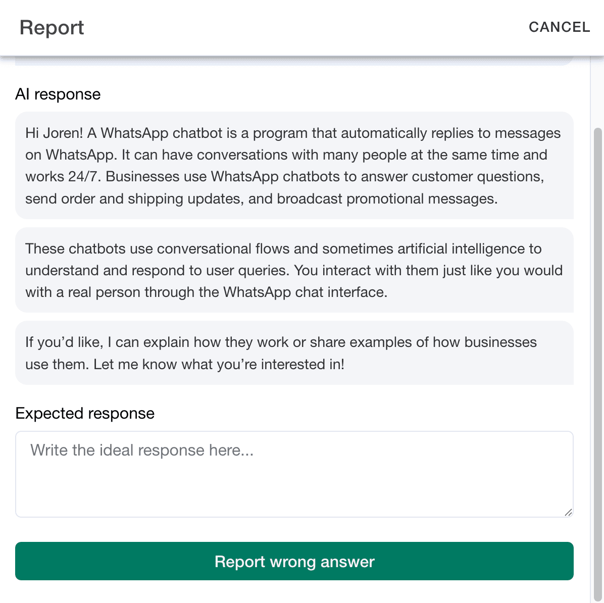 You can also improve your AI’s answers. If the chatbot gives a wrong or incomplete reply, you can report the answer and improve the expected response: