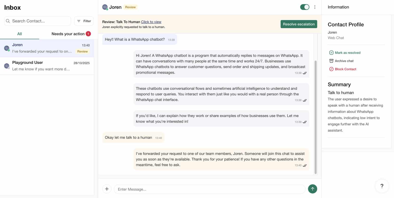 When your AI chatbot can’t handle a question or when a customer asks to speak with a human, the chat is handed over to this inbox. From there, you or your team can continue the conversation manually.