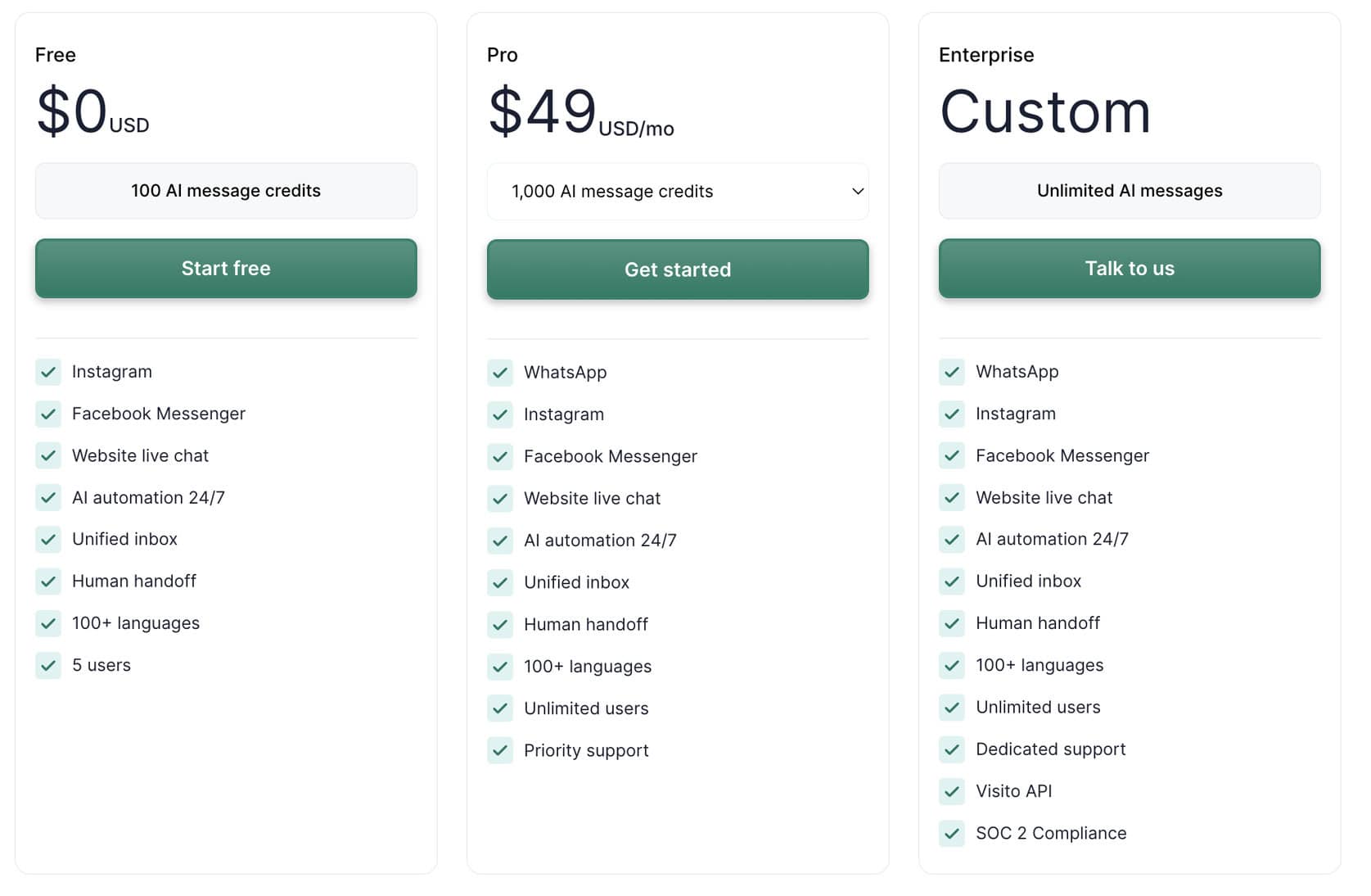 Visito AI has a free plan, and paid plans start at $49/month for 1,000 message credits. The free plan gives you 100 messages per month. It comes with website live chat, AI automation and human handoff. This allows you to test their platform:
