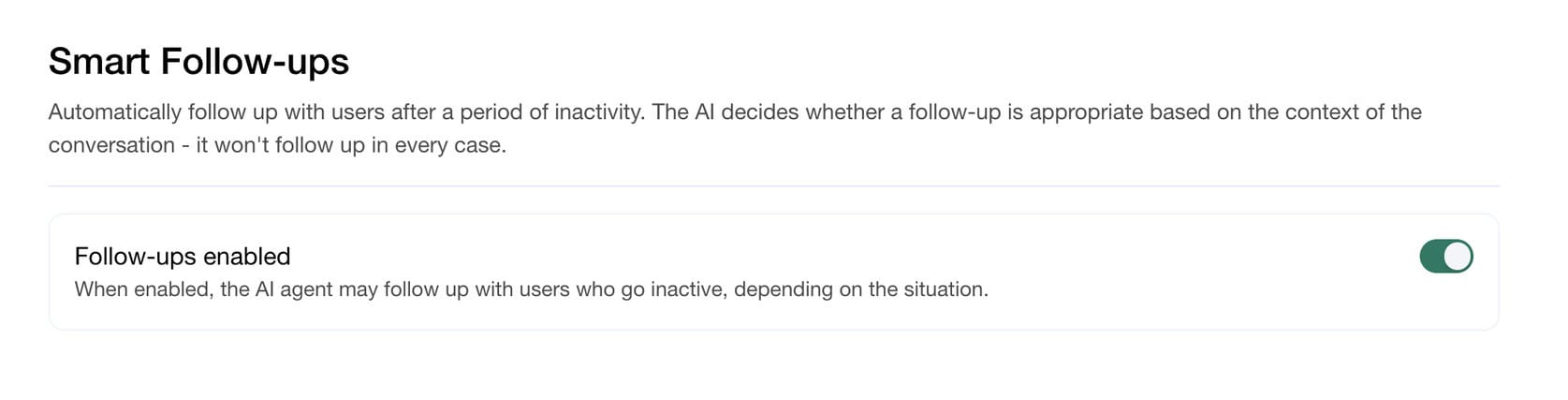 Visito includes smart follow-ups. When enabled, it automatically follows up with users who haven’t replied after a certain time. It helps keep leads engaged without extra effort:
