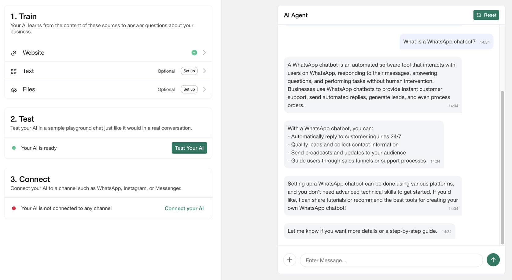Once your AI is trained, you can test it immediately within the platform and talk to it like a user would: